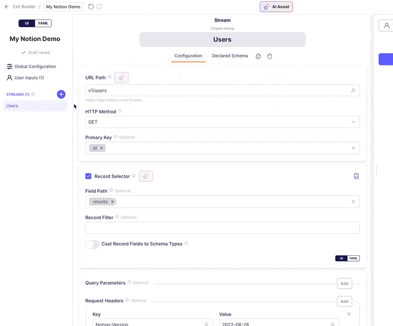• Within your existing connectors by clicking the "AI Assist" button at the top of the builder.